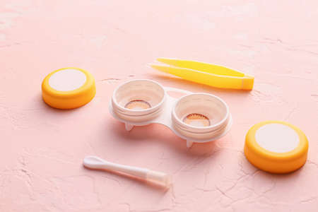 Contact lenses and accessories on color background