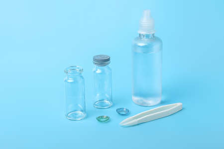 Contact lenses, solution and tweezers on color background