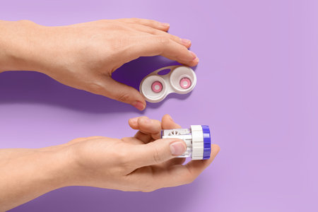 Female hands with cleaning case for contact lenses and container on lilac background