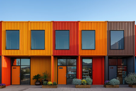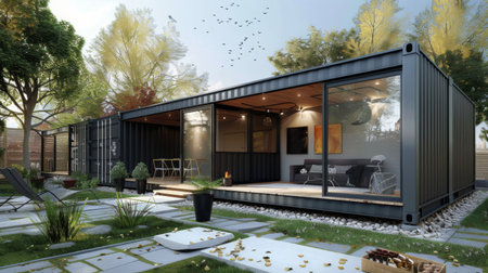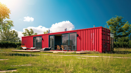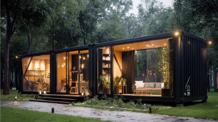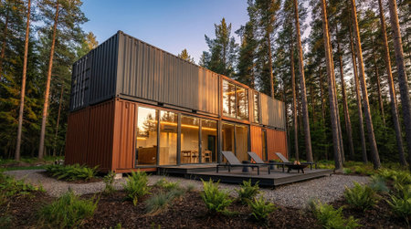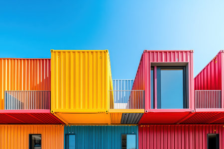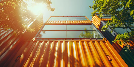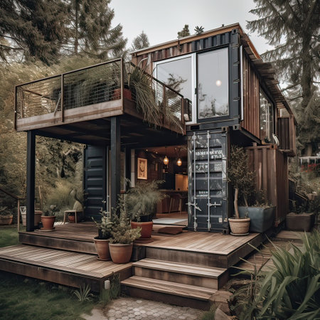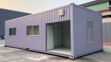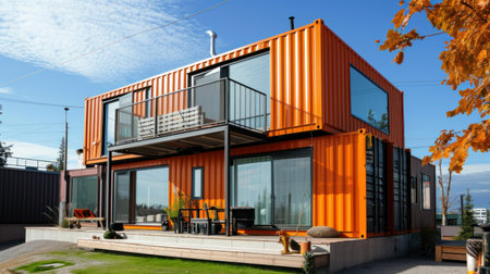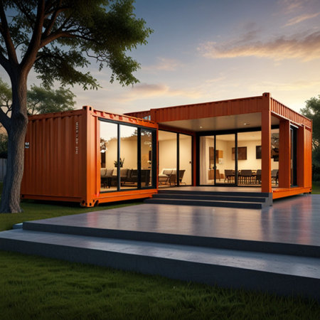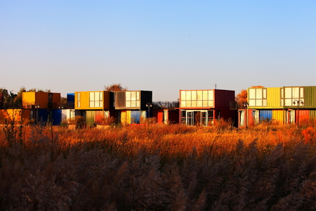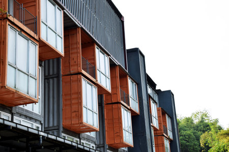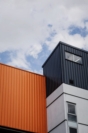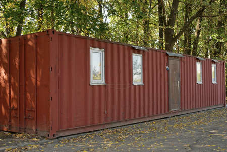 The photo of the house with windows and doors made of iron containers for cargo transportation