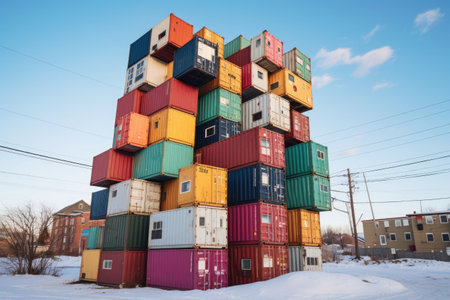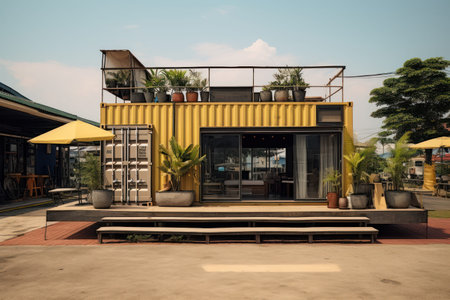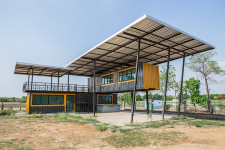 An outdoor cafe made of sea containers, colored iron boxes stand on the roof of the house, a summer terrace of a country house, a place to relax. high quality photo