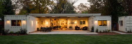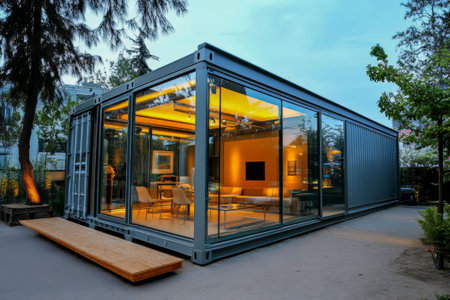 metallic barn frame cabin with electric bulb warm illumination in twilight dusk low light condition space