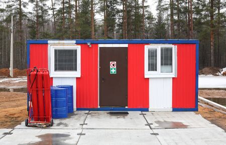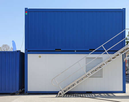 Construction trailers for workers at the new construction site. Mobile containers and cabins base for the site manager and employees.
