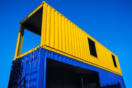 A weathered blue and yellow striped container with two windows and a door under the sky