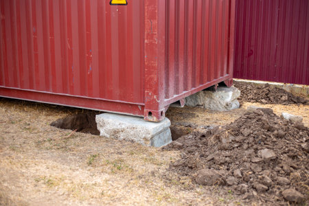 The cargo container stands on concrete supports, cracks and mounds of excavated earth are visible around the base.