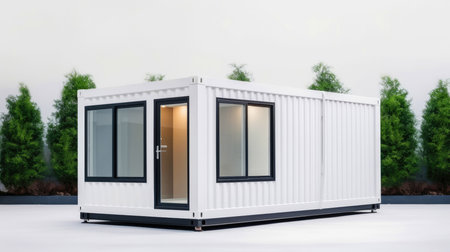 Industrial cabin residential container with glass windows on the Aegean sea shore in summer, selective focus