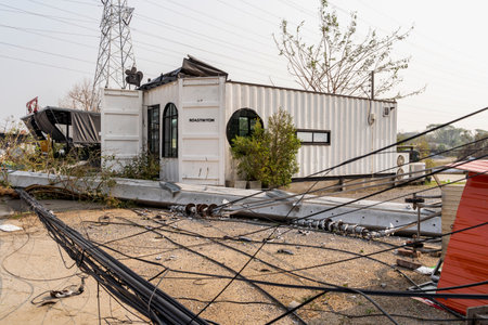 MUENG, CHIANGMAI/THAILAND MARCH 2023, 18 : High voltage electricity post damage and falling down on house and cars due to severe Storm , heavy wind and rain disaster. Building damage from storm