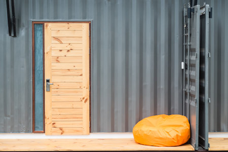Orange bean bag in front of a wall made of cargo container with wooden door