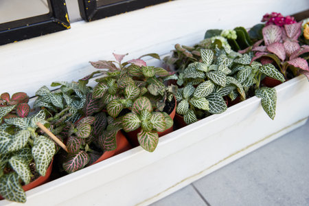 Various green plants and blossoming flowers in boxes on a doorstep. Decorating house windows at summer.