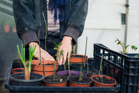 Woman gardener replanting plants in garden, business selling trees and shrubs to nurseries shop