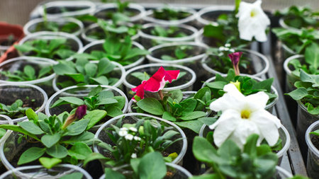 Colorful petunias bloom in clear plastic containers, thriving in sunlight at a vibrant garden nursery filled with greenery.