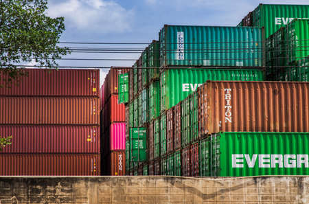 Bangkok,Thailand - May 20, 2021 : Industrial containers box for Logistic import export business concept. Stacked cargo containers in storage area. No focus, specifically.