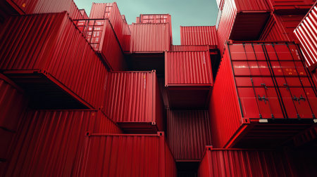 A captivating image featuring a towering stack of red shipping containers against a blue sky, illustrating modern industrial design and logistics.