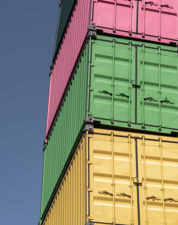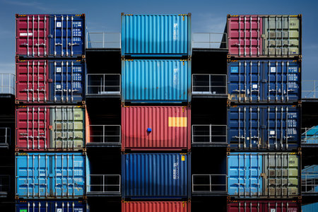 Colorful shipping containers stacked against bright blue sky create vibrant scene.