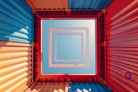 A vibrant scene featuring sunlight shining through a narrow gap between stacked shipping containers, offering a unique perspective of industrial logistics and striking colors.