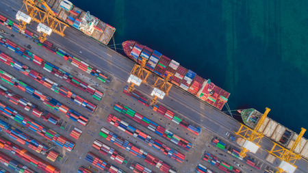 Container ship in export and import business and logistics. Shipping cargo to harbor by crane. Water transport International. Aerial view and top view.