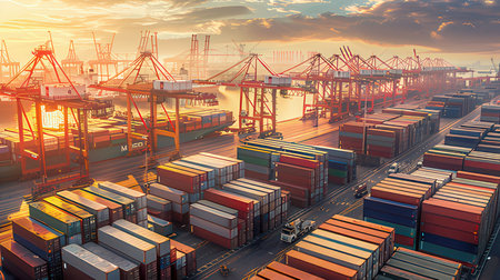 shipping container terminal in shanghai at dusk, modern harbor and global trade background