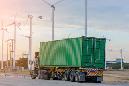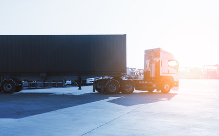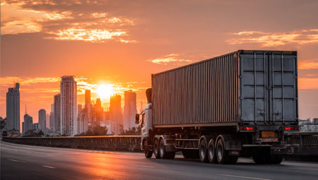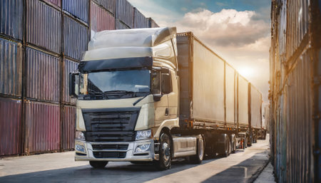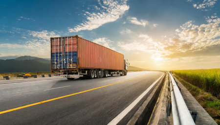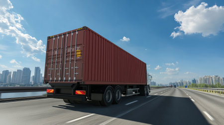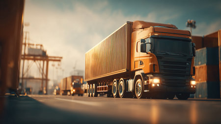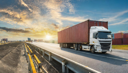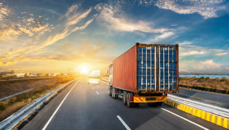 A vivid depiction of the logistics, import-export, and cargo transportation industry captured through a container truck driving on a highway, representing the vital role of trucking in the