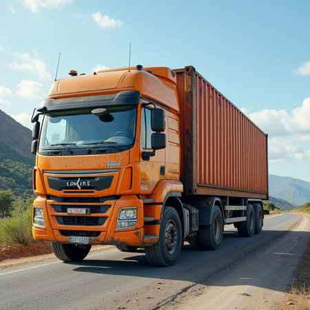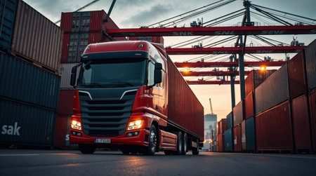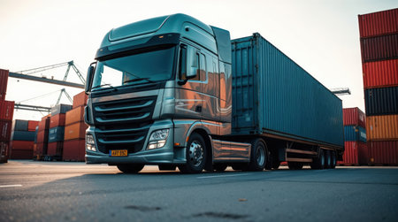 High-resolution image of a container truck emphasizing global logistics, showing the integration of import-export trade, efficient cargo transport, and supply chain operations pivotal to