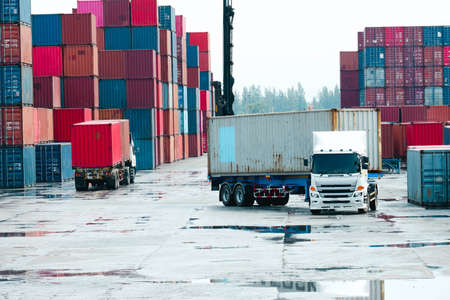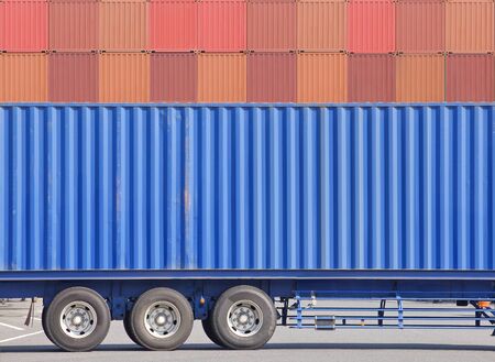 Container cargo truck and stack of container in background