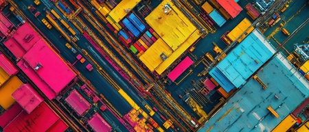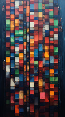 An overhead view displays a striking arrangement of colorful shipping containers. The composition features a rich tapestry of reds, greens, blues, and yellows, forming a textured pattern. The style suggests a modern, abstract representation. Ideal for commercial applications.