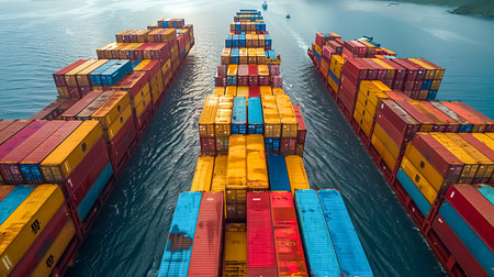 An overhead shot presents several cargo ships laden with vibrant shipping containers. The composition features diverse colors and patterns, suggesting international trade. The overall style appears commercial, potentially suitable for visuals related to logistics, transportation, or global commerce. This image is suited for various commercial and editorial applications.