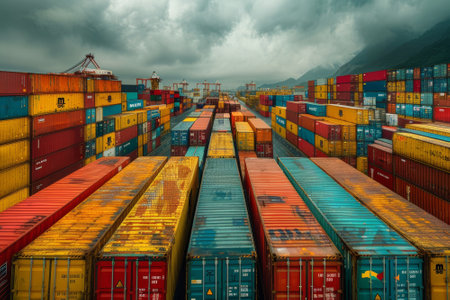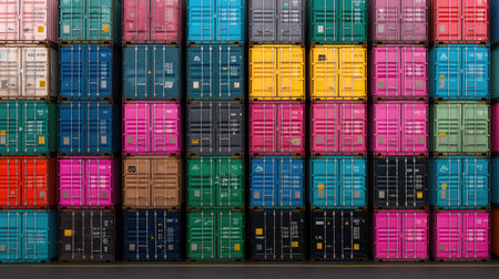 Colorful shipping containers stacked in busy port create vibrant and organized scene. arrangement showcases various hues, emphasizing logistics and trade industry