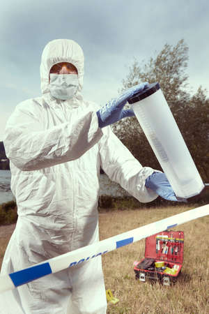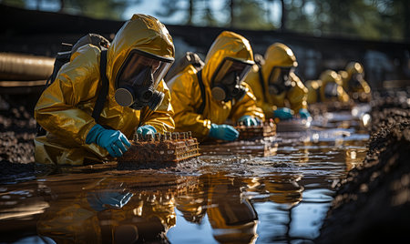 Scientist or ecology expert in protective costume with water samples probe for quality control from dirty contaminated water for scientific research