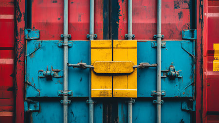 A vibrant shipping container showcasing a sealed design with a colorful locking mechanism. Ideal for topics related to transport and logistics.