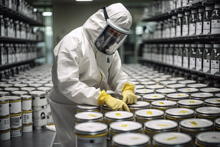 a person wearing a protective suit in a room full of jars and containers with yellow labels on them, as if theyre