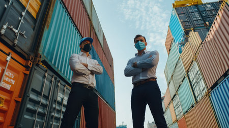 Businessman standing at shipyard and engineer wearing mask partner stand at container yard, loading containers box from cargo freight ship for import and export, teamwork partnership concept. -