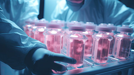 Coronavirus covid 19 infected blood vial in hand of female doctor with surgical mask and glows. Coronavirus covid 19 reseach laboratory, coronavirus covid-19 vaccine research. Selective focus