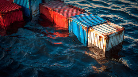 An eye-level close-up depicts shipping containers of red, blue and white submerged in dark, wavy ocean water. Containers are slightly rusted, showing wear. Sunlight reflects on the waves.