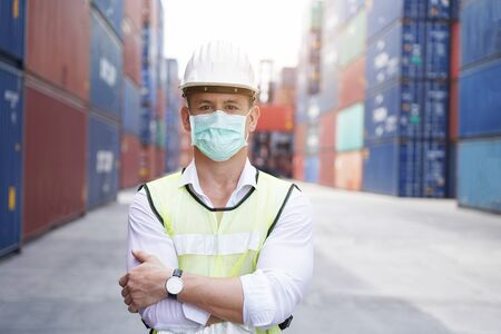 Workers wearing protective face mask during coronavirus and flu outbreak and yellow safety hard hat helmet at container yard.