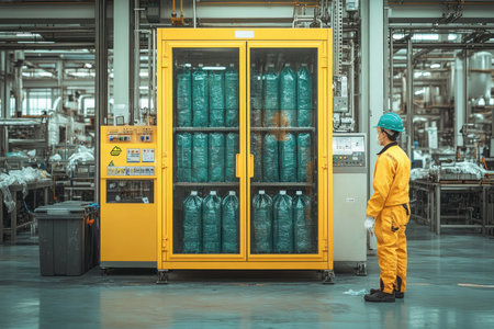 A vibrant industrial scene featuring yellow storage drums arranged along a water-filled aisle in a factory, showcasing modern manufacturing equipment and bright lighting.