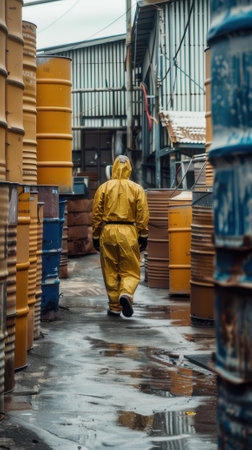 A man in a yellow chemical protective suit walks along the street. The concept of environmental pollution.