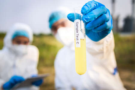 Close up sample of factory wastewater in a test tube. water pollution in the pond, river, lake, sea concept