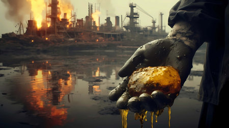 Toxic waste from human hands Industries that create pollution and cities that are affected by pollution. created by ai