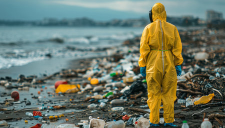 A person in a yellow hazmat suit stands amidst a waste management facility, highlighting the importance of safety and environmental responsibility in industrial settings.