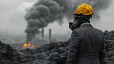 A man in a respirator stands against a smoking factory chimney. garbage around. ai