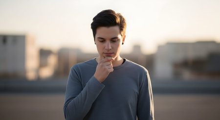 A young man standing outdoors with his hand on his chin, deep in thought against a blurred sunset background. The portrait conveys emotions of contemplation, decision-making, or worry.