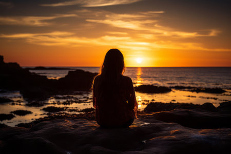 Rear view of casual woman contemplating scenic sunset over calm ocean, feeling serene and inspired by nature's beauty