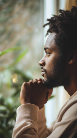 A man gazes thoughtfully out of the window as rain falls, surrounded by plants that add warmth to the indoor atmosphere.