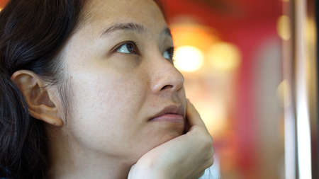 sad woman 35 years is bored and sadness at window in cafe. Melancholy, loneliness, depression. Disappointment concept.