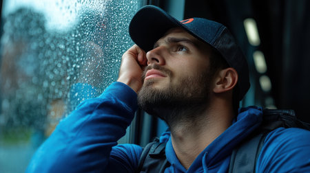 A man wearing a blue hat and a blue hoodie is looking out the window of a bus. He is deep in thought, possibly contemplating his next destination or simply enjoying the view outside