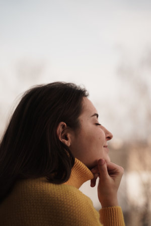 A side view of an elegant brunette Ukrainian female smiling with her hand under her chin