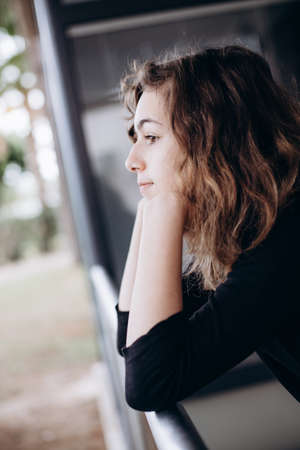 pensive girl looks into the distance. brunette looks into the distance.