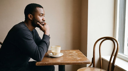 Man sitting alone at small cafe table with coffee cup, looking thoughtfully out bright window in quiet indoor setting.