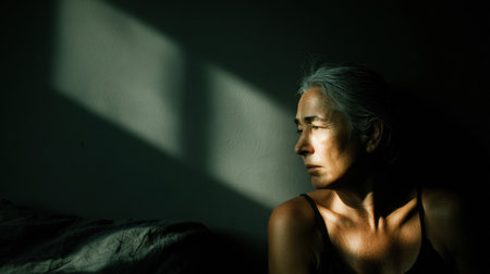 A woman stands still facing a blue wall. A beam of light shines on her face, creating a contrast with the darker background. The setting is indoors with natural light coming in.