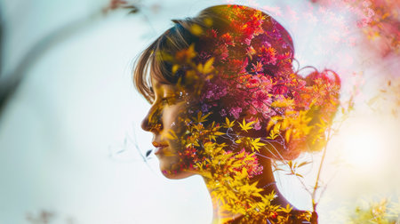The closeup double exposure picture between young adult beautiful female caucasian human and bright beautiful nature in the morning or evening that the picture stand for peaceful of the life. AIGX01.